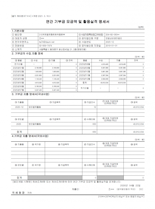 2025기부금 모금액 활용실적공개 페이지 정보 작성자 관리자 작성일26-04-30 21:55 조회5회 댓글0건 관련링크 다음글 목록 본문 2025연간 기부금 모금액 활용실적 명세서 첨부합니다. 댓글목록 등록된 댓글이 없습니다. 다음글 목록